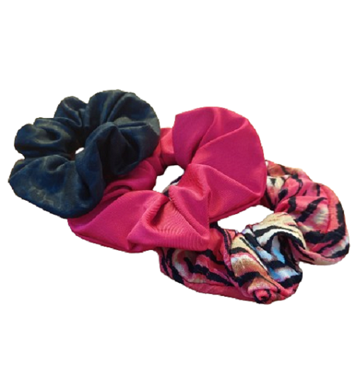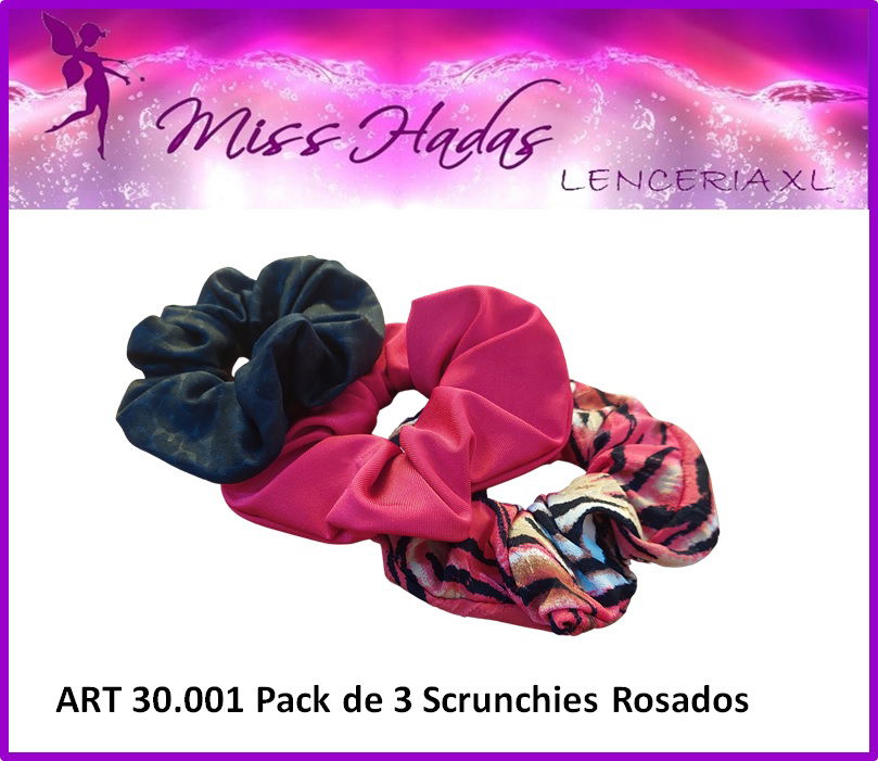 ART. 30.001: PACK x 3 de scrunchies en lycra Añade un toque de estilo a tu look diario con nuestro pack de scrunchies en colores vibrantes: negro, fucsia y estampado de cebra. Estos scrunchies son más que un simple accesorio, son una solución elegante para mantener tu cabello bajo control.